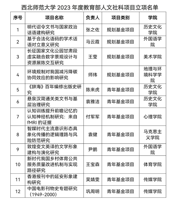 西北师大获批2023年度教育部人文社会科学研究项目12项
