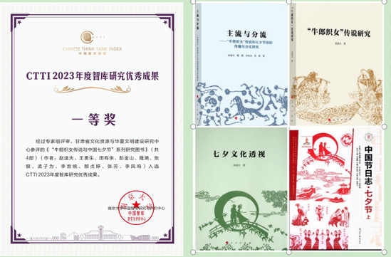 本次获奖的“牛郎织女传说与中国七夕节”系列著作,由西北师大文学院教授赵逵夫及团队完成。该研究团队长期致力于牛郎织女传说研究,先后发表相关论文40多篇,出版相关论著8部。本次申报,是该团队近两年的相关研究成果,共4部:《主流与分流——“牛郎织女”传说与七夕节俗传播与分化研究》,人民出版社2023年;《中国节日志•七夕节》,光明日报出版社2023年;《七夕文化透视》,人民出版社2022年;《“牛郎织女”传说研究》,人民出版社2022年,总计198万字。