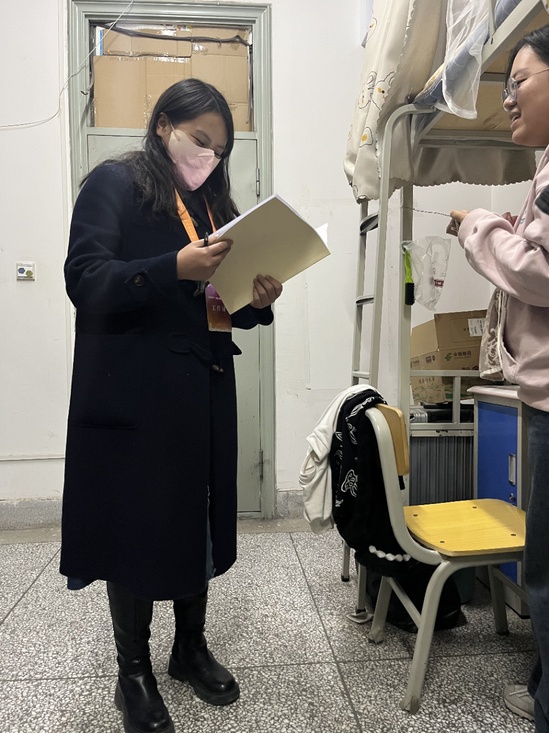 113日放假至今,西北师大党员骨干和学生代表组成的学生自我监督服务岗志愿者检查基础生活设施运行情况、深入走访学生公寓、与宿舍管理员和留校同学座谈交流、接听来电反馈意见建议,全面了解留校学生思想动态和学习生活情况,耐心听取并记录同学们对假期生活保障、公寓管理等方面提出的诉求,引导宿舍成员做好防火、防盗、防诈骗等安全工作,排查安全隐患,筑牢安全防线,为假期留校学生创造良好的学习氛围和生活环境。