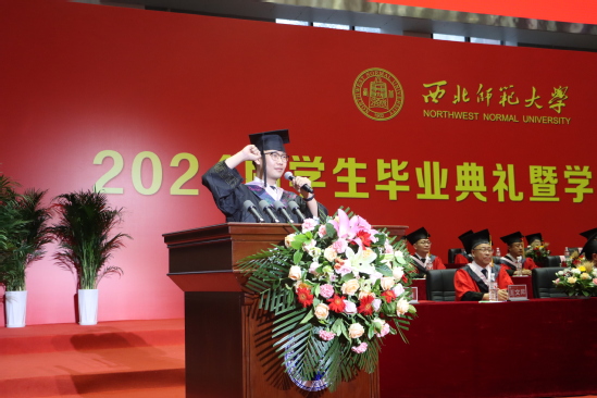 2024届本科毕业生代表、教育科学学院2020级教育学专业白燕在发言中表示,四年来,我们被西师精神、西师情怀和西师行动所滋养,见证了百廿师大事业的蒸蒸日上,见证了师大学子在不同领域中发光发热,见证了各学科向上向好的发展态势。在未来的日子里,我们每一位师大学子都将以更加饱满的热情和更加坚定的信念,为实现自己的人生目标而努力奋斗,为母校增光添彩而奋斗。
