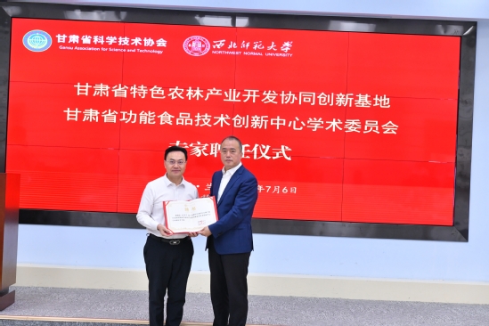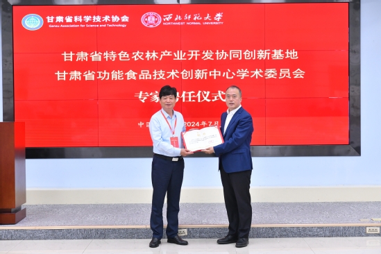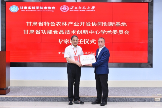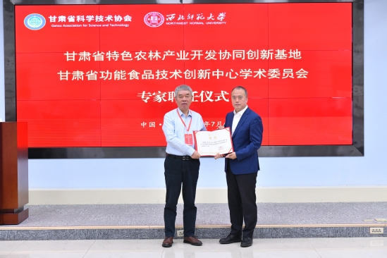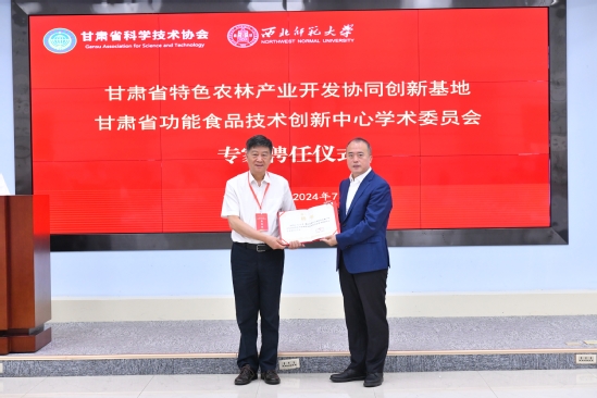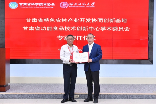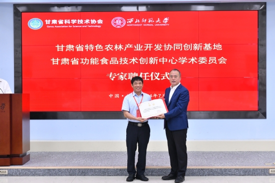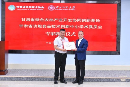 西北师大校长王占仁为院士、专家颁发了甘肃特色农林产业开发协同创新基地和甘肃省功能食品技术创新中心咨询专家委员会委员聘书。