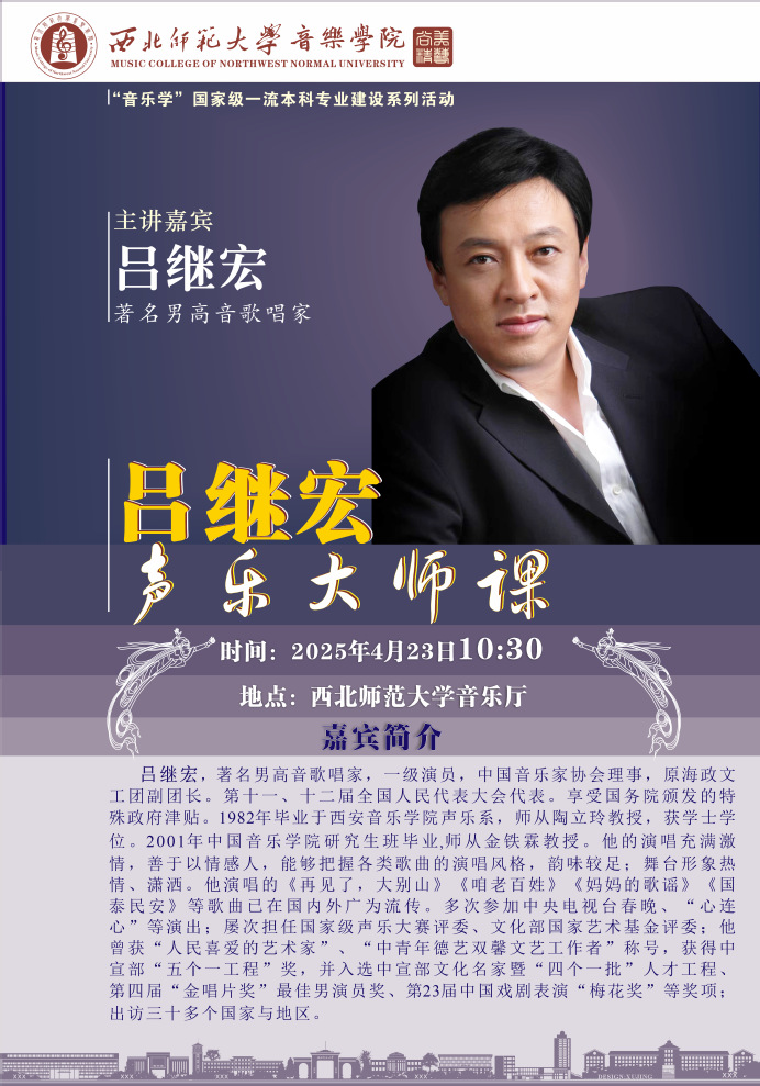吕继宏,著名男高音歌唱家,一级演员,中国音乐家协会理事,原海政文工团副团长。第十一、十二届全国人民代表大会代表。享受国务院颁发的特殊政府津贴。1982年毕业于西安音乐学院声乐系,师从陶立玲教授,获学士学位。2001年中国音乐学院研究生班毕业,师从金铁霖教授。他的演唱充满激情,善于以情感人,能够把握各类歌曲的演唱风格,韵味较足;舞台形象热情、潇洒。他演唱的《再见了,大别山》《咱老百姓》《妈妈的歌谣》《国泰民安》等歌曲已在国内外广为流传。多次参加中央电视台春晚、“心连心”等演出;屡次担任国家级声乐大赛评委、文化部国家艺术基金评委;他曾获“人民喜爱的艺术家”“中青年德艺双馨文艺工作者”称号,获得中宣部“五个一工程”奖,并入选中宣部文化名家暨“四个一批”人才工程、第四届“金唱片奖”最佳男演员奖、第23届中国戏剧表演“梅花奖”等奖项;出访三十多个国家与地区。