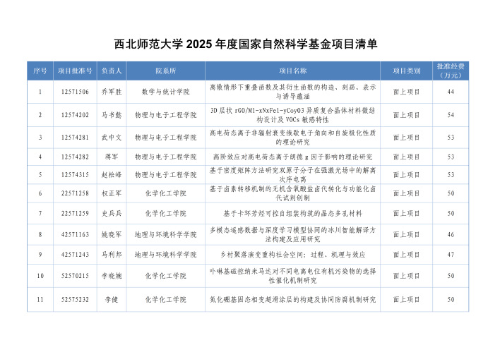 国家自然科学基金是国家资助基础研究、应用基础研究和人才培养的主要渠道,在推动基础研究发展、培育人才队伍方面发挥了重要作用。西北师大始终高度重视国家自然科学基金的申报与组织工作,不断完善校院两级联动机制,深入推进有组织科研,持续加强青年教师和高层次人才培养力度。未来,学校将进一步夯实基础研究根基,强化学科建设,加强学科交叉,加大创新人才培育力度,提升原始创新能力,以更高水平的科研成果助力学校“双一流”建设,为服务国家战略需求和推动甘肃高质量发展贡献更多智慧和力量。