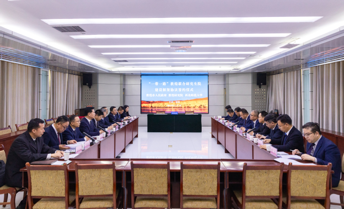党委书记贾宁,敦煌研究院院长苏伯民,酒泉市委常委、敦煌市委书记王彦群共同为“一带一路”敦煌联合研究生院揭牌。副校长张明军,敦煌研究院党委委员、副院长赵林毅,敦煌市委常委、常务副市长付虎代表三方签署“一带一路”敦煌联合研究生院建设框架协议。